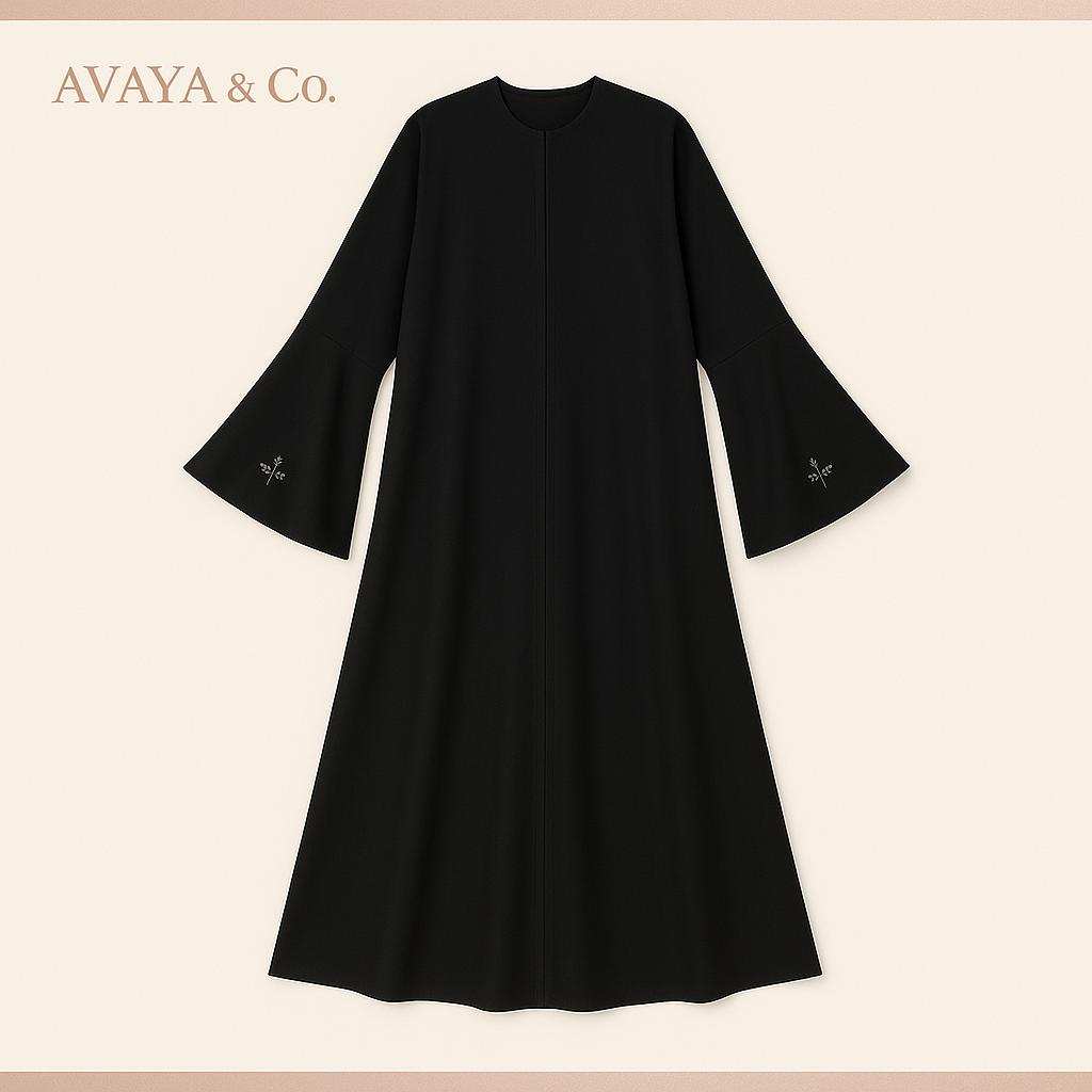 عباية بأكمام واسعة وفتحة خلفية عميقة وحواف هندسية بخيوط ذهبية.