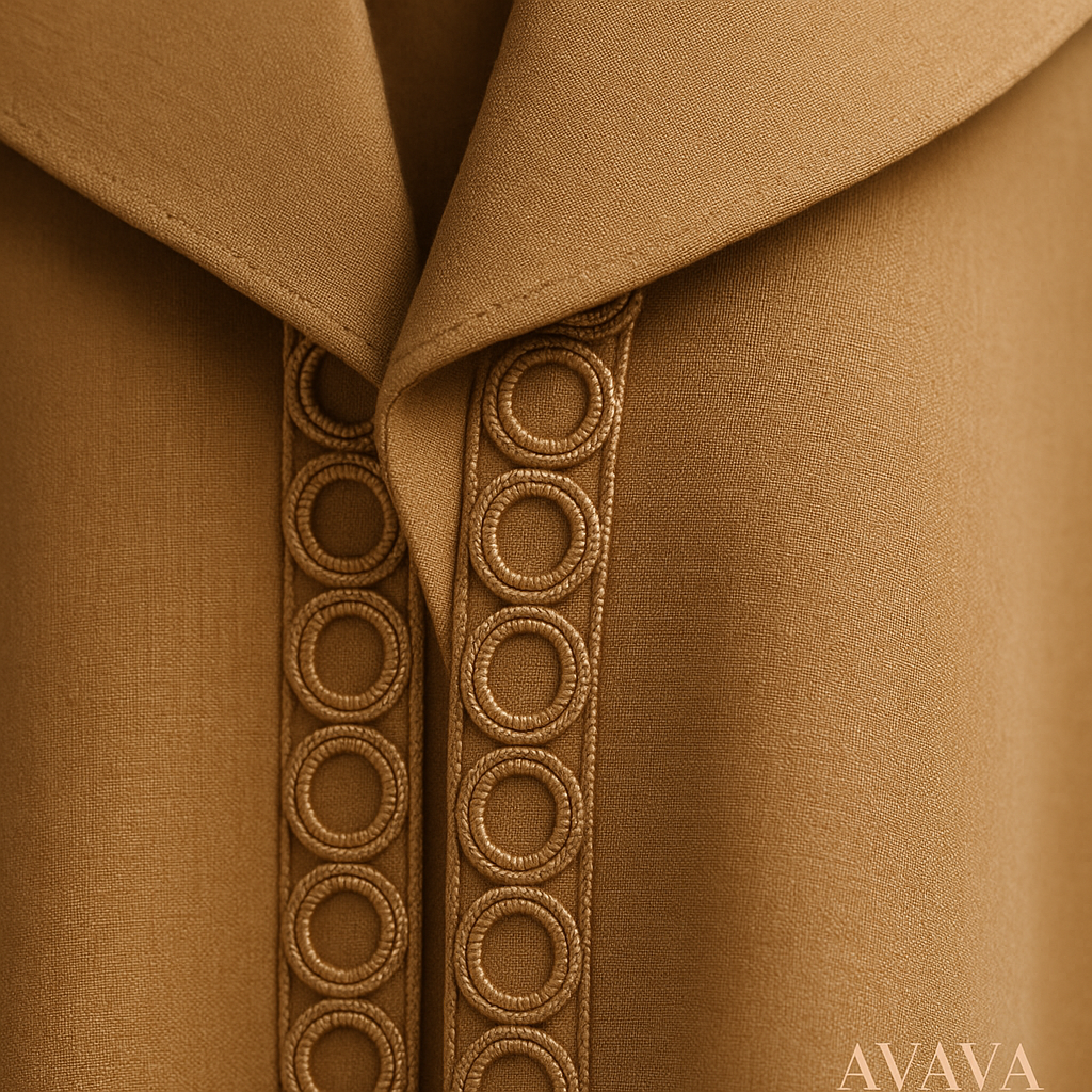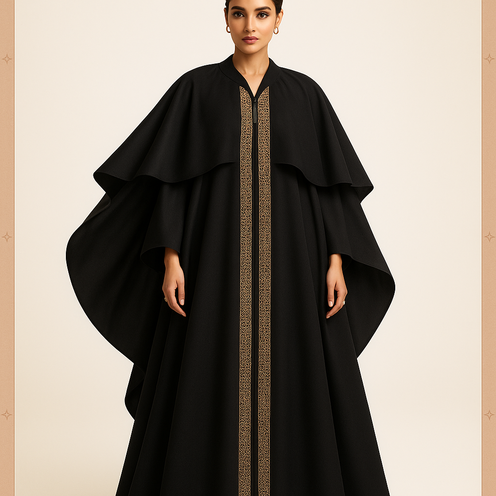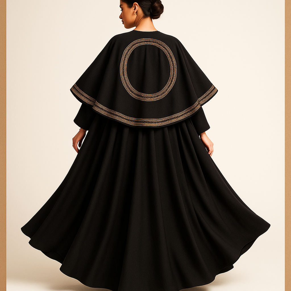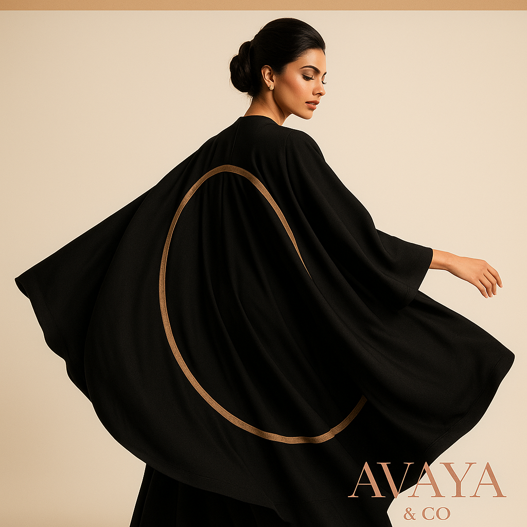 عباية منظمة تتميز بتصميم أنيق مع لمسة دائرية مميزة عند الخصر، مما يوفر مظهرًا عصريًا وأنيقًا