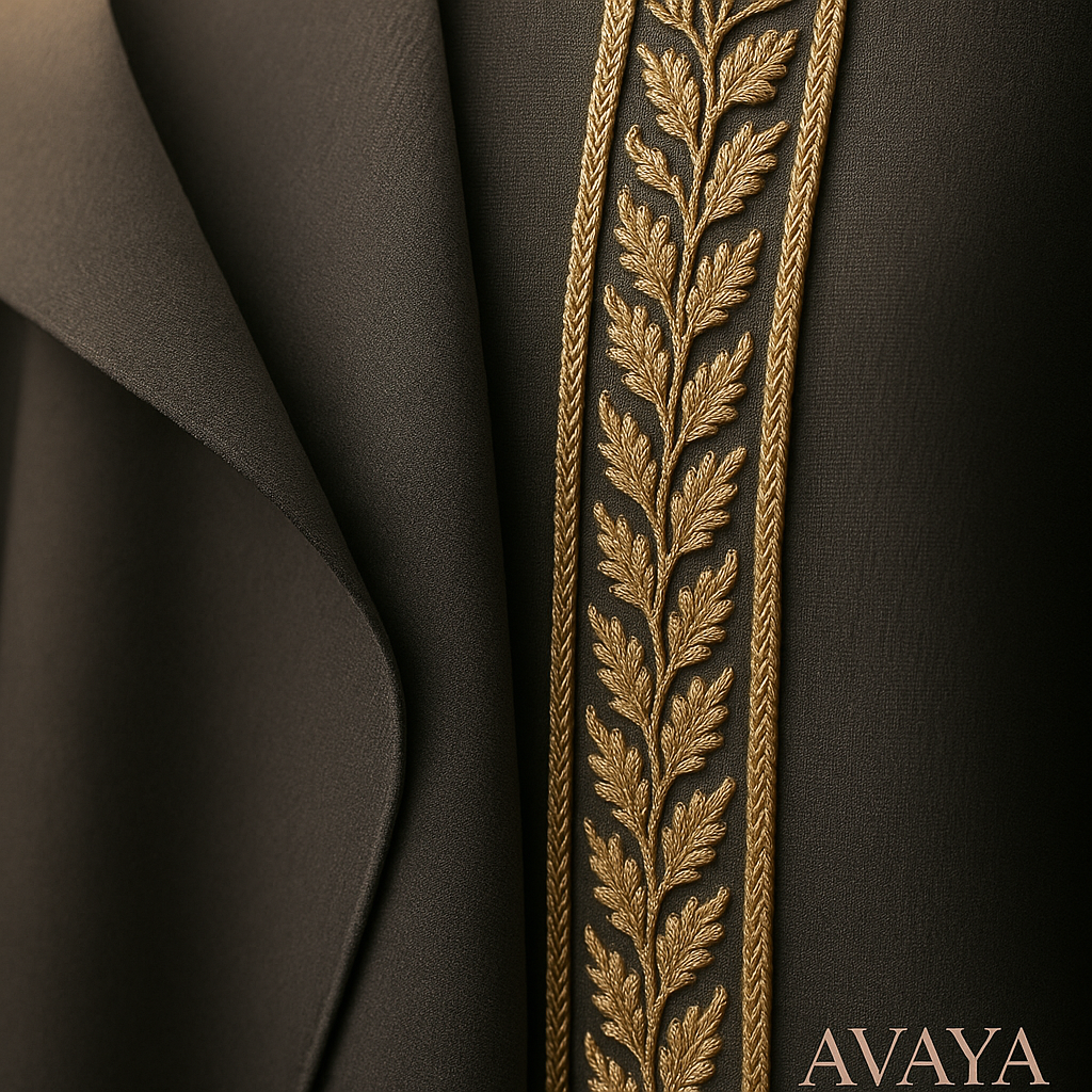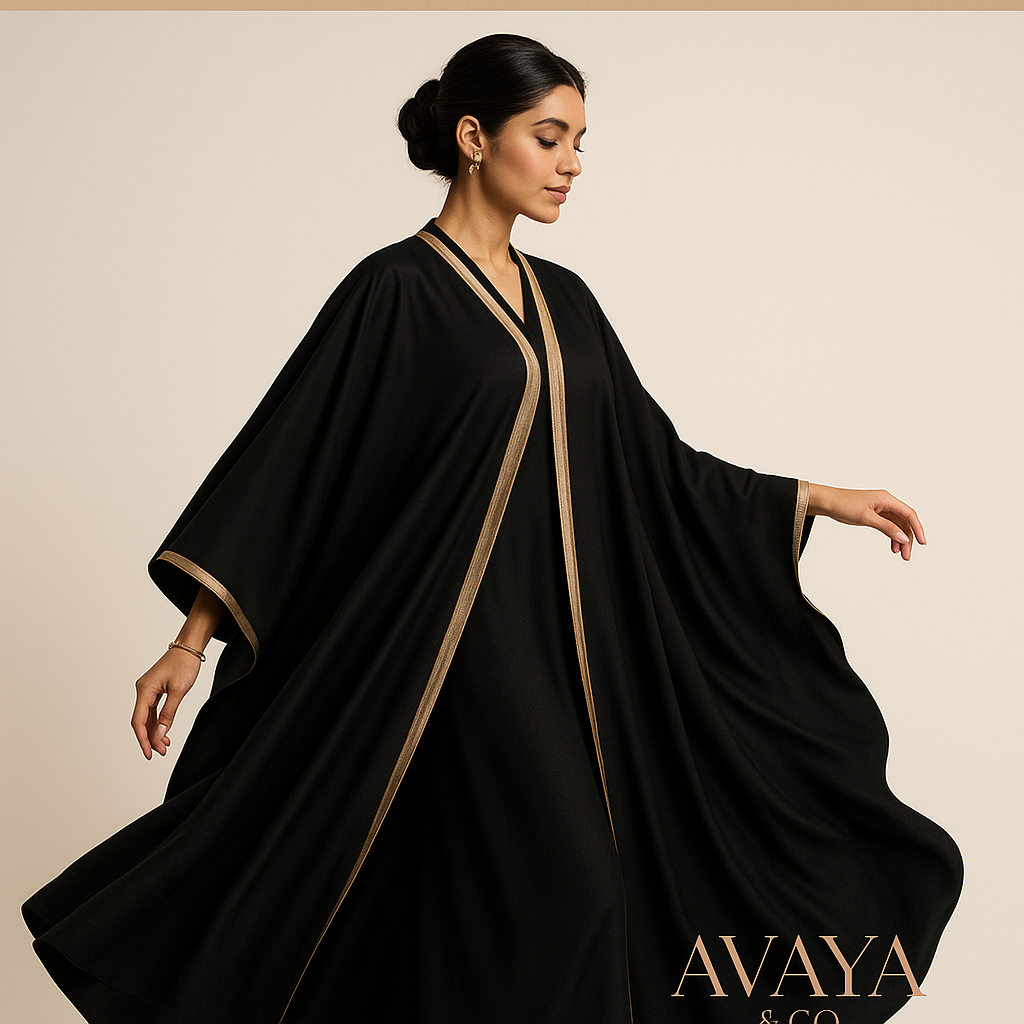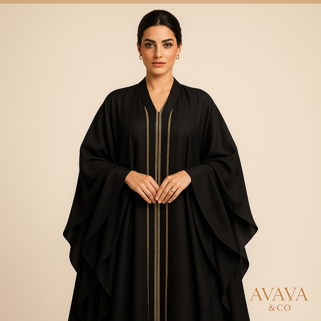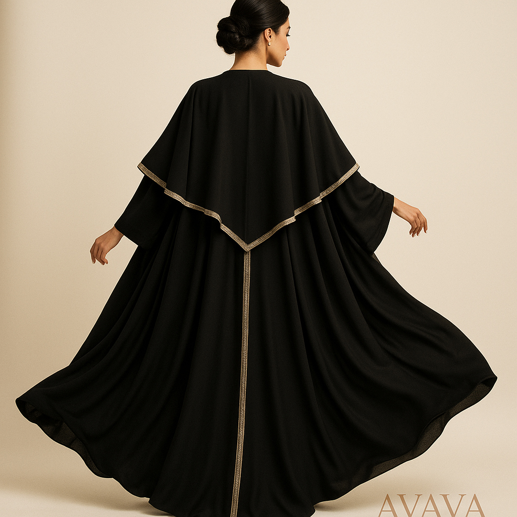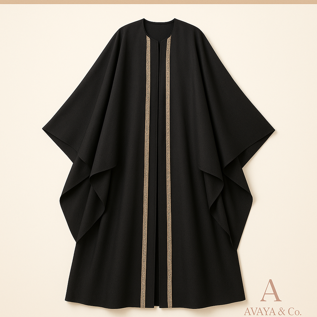 عباية طويلة تصل إلى الأرض مع غطاء قابل للفصل مطرز بخيوط ذهبية.