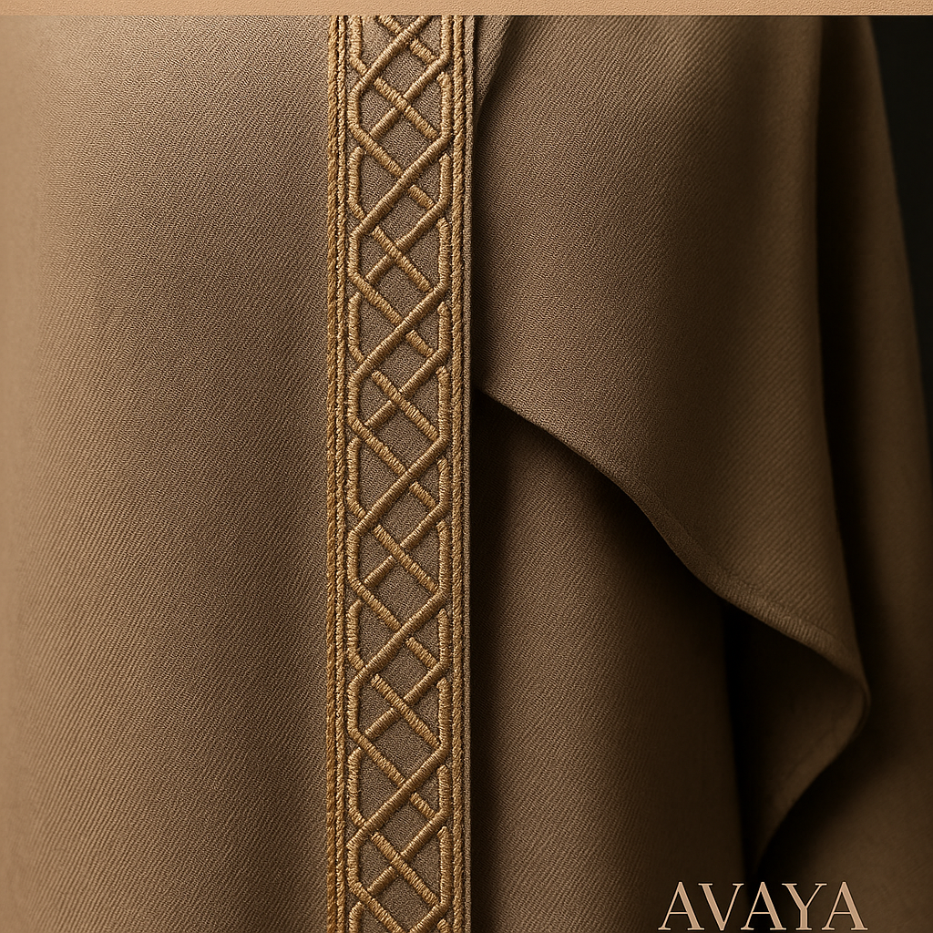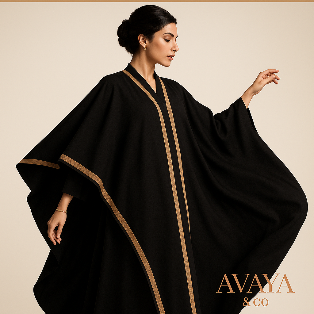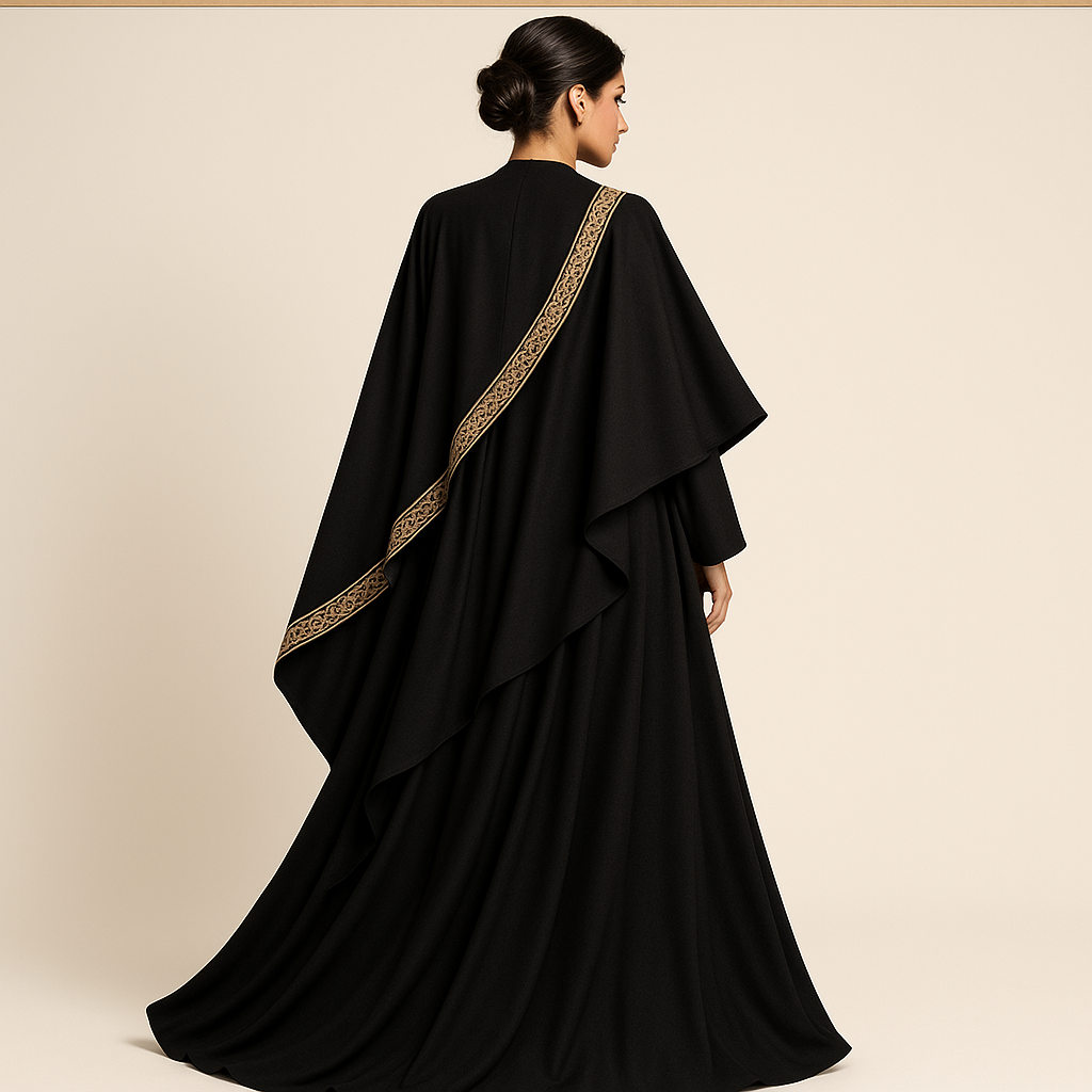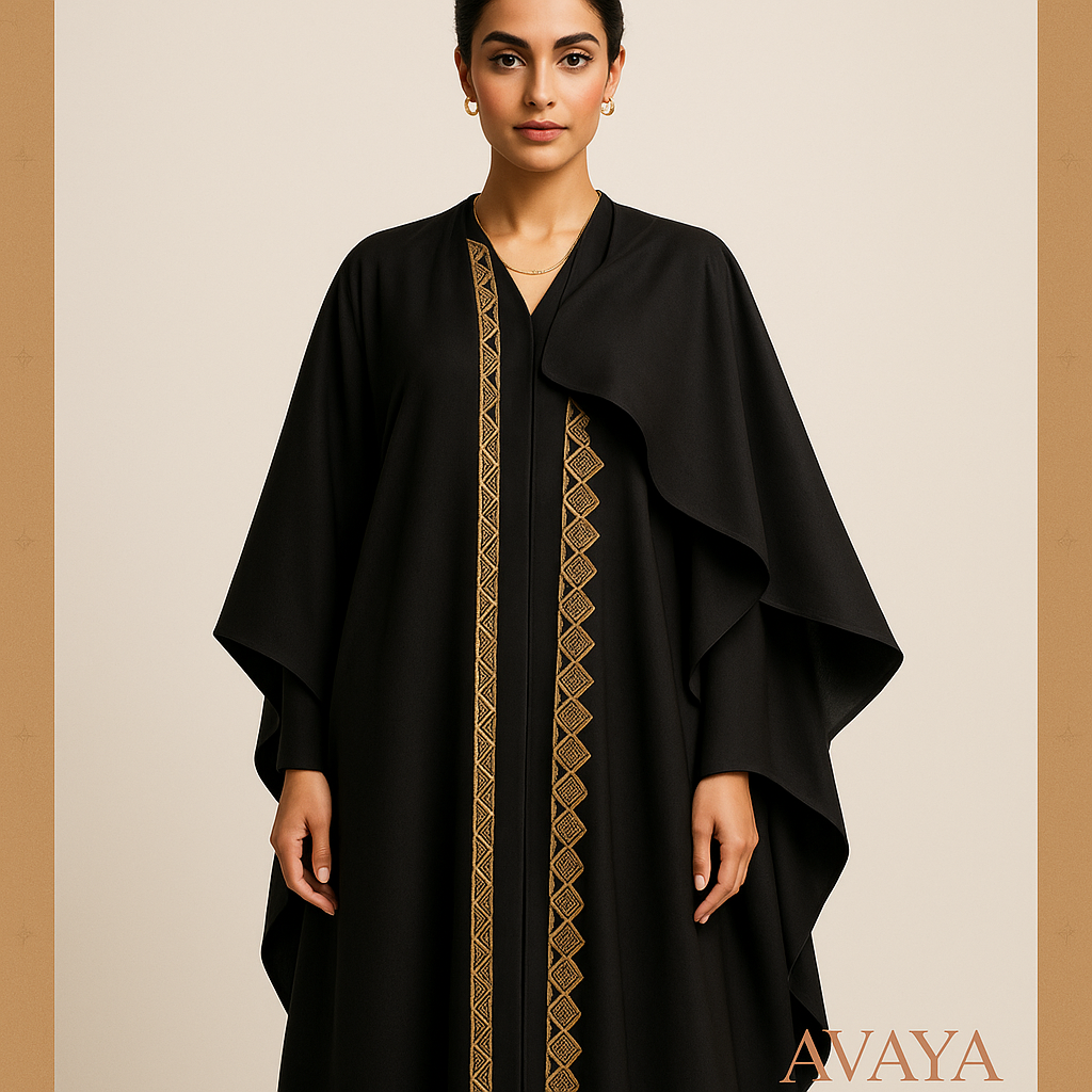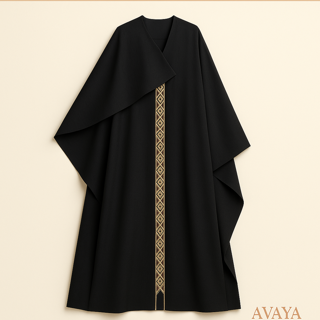 عباية كبيرة الحجم بفتحة رقبة على شكل حرف V عميقة وحواف مزينة بشراشيب مخيطة يدويًا.