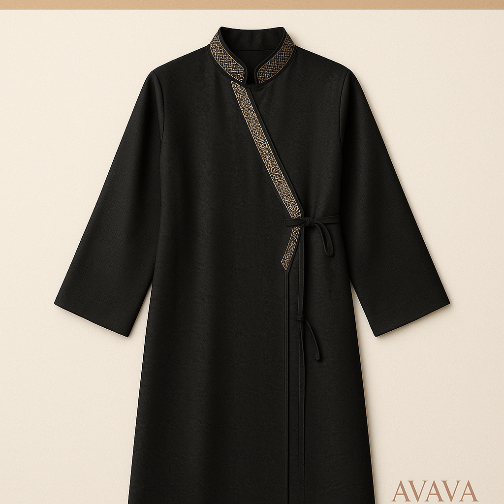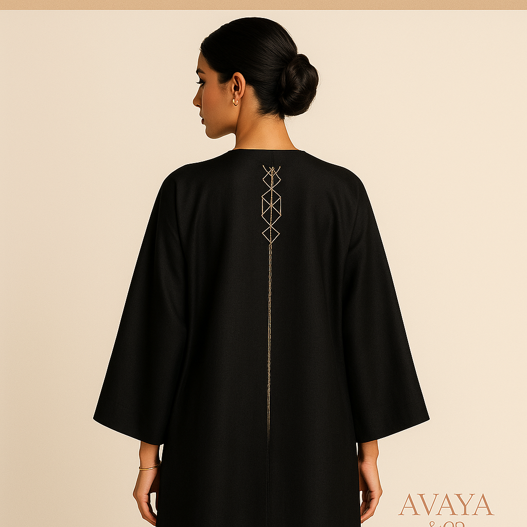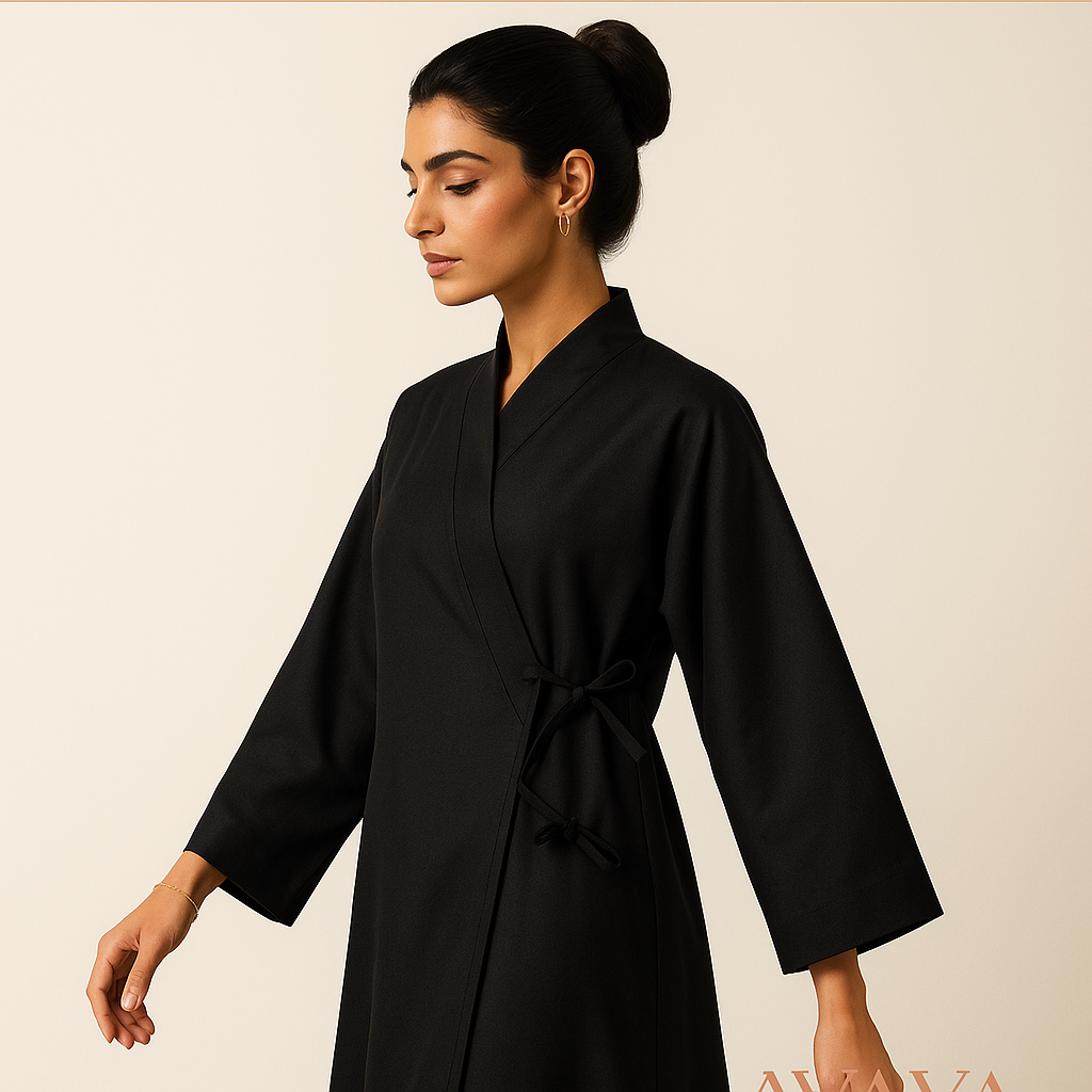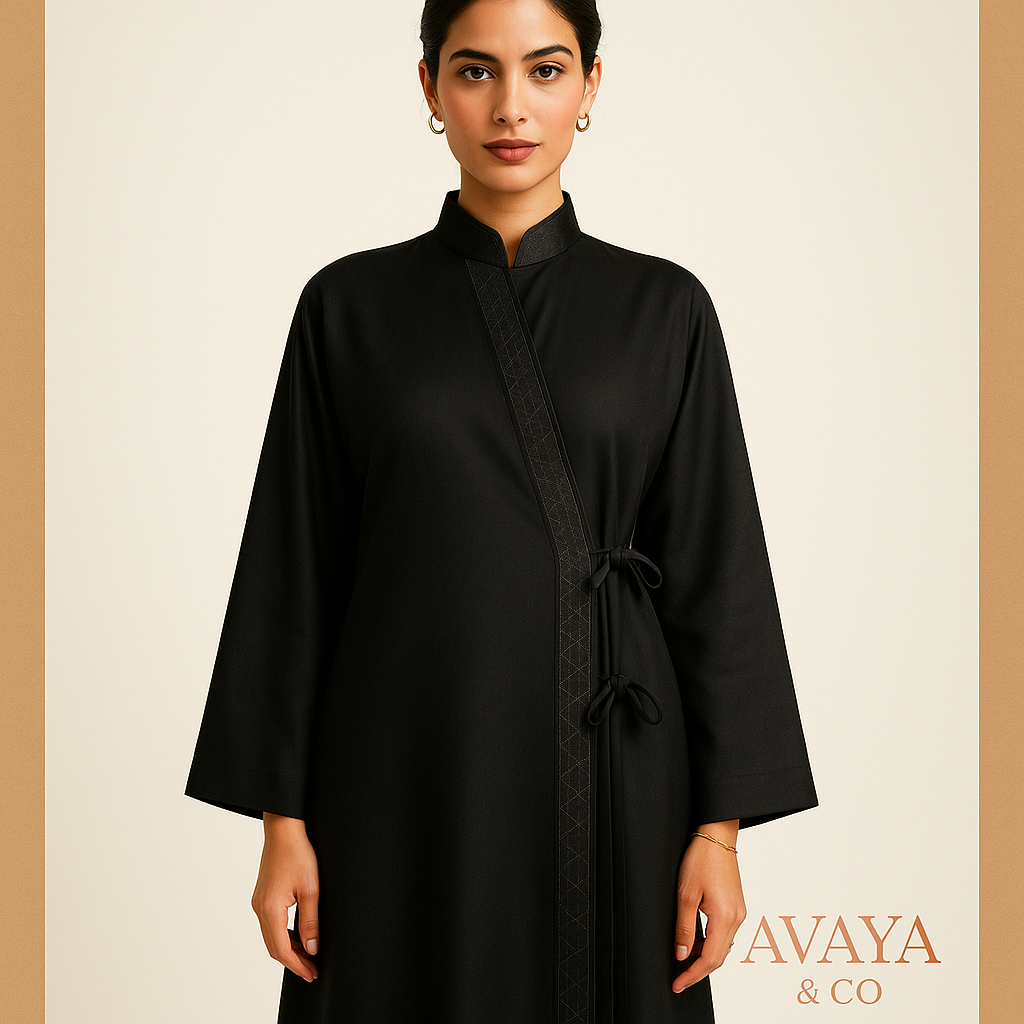 عباية بتصميم ملفوف مع تفاصيل خيوط ذهبية بسيطة.